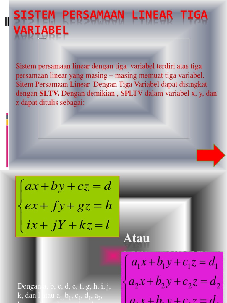 Sistem persamaan linear tiga variabel adalah suatu sistem persamaan linear dengan memuat tiga variabel. Dalam suatu persamaan nilai mutlak linear satu variabel garis bilangan dipakai sebagai media yang berguna dalam menunjukan nilai mutlak.