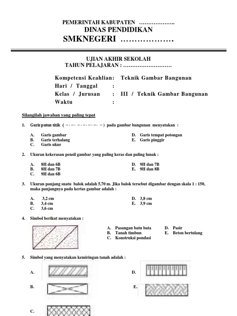 Soal dan jawaban gambar teknik bangunan. Soal teori kejuruan teknik gambar bangunan ini bukan prediksi soal 20172018 melainkan stk teknik gambar bangunan tahun tahun sebelumnya yang dapat dimanfaatkan sebagai soal latihan dan beberapa diantaranya sudah disertai dengan kunci jawaban. Tryout ujian teori kejuruan teknik gambar bangunan menyiapkan siswa kelas xii untuk menghadapi ujian sesungguhnya. Kisi kisi ujian teori kejuruan terbuka untuk umum.